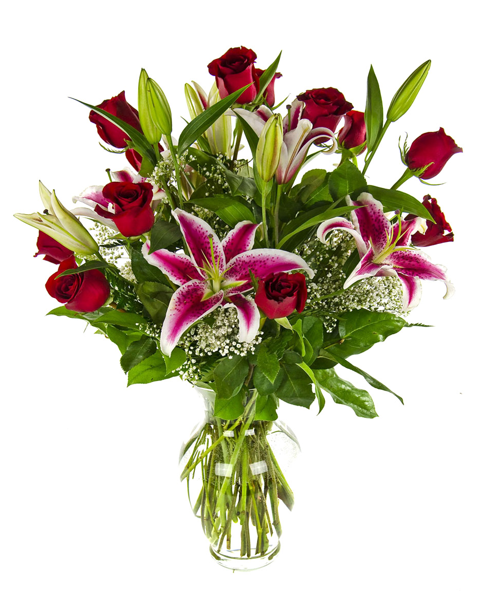 Nine elegant Red Roses paired with three aromatic Stargazer Lilies and a touch of Baby's Breath will remind you and your loved one of a night under the stars.